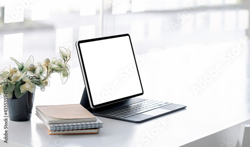 Fototapeta premium Mockup blank screen tablet with keyboard on white wooden table in modern office room.