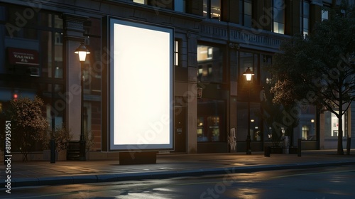 © Adi, Obraz premium Mockup. Blank white vertical advertising banner billboard stand on the sidewalk at night