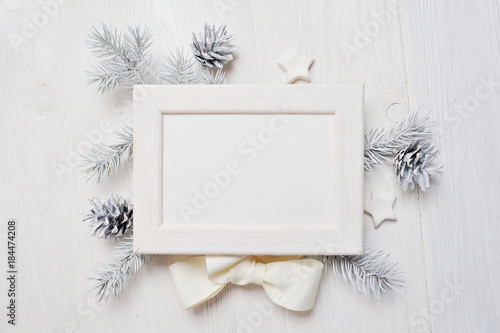 Fototapeta premium Mockup Christmas greeting card top view and white frame, flatlay on a white wooden background with a ribbon, with place for your text