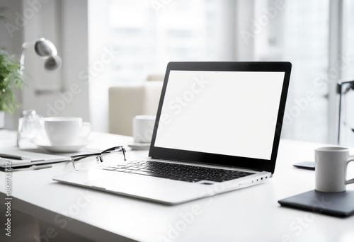 Fototapeta premium 'mockup computer laptop notebook space working office white modern three-dimensional background blank screen business comfortable contemporary creative design desk desktop display home'