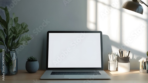 © Jack, Obraz premium Mockup computer laptop on workspace with empty screen.