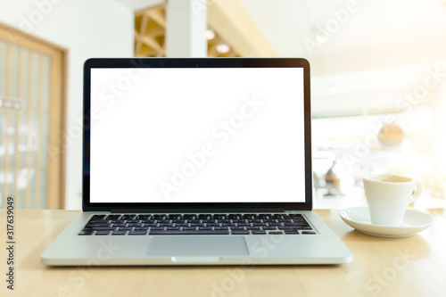 © panitan, Fototapeta premium mockup image blank screen computer with white background for advertising text,hand woman using laptop contact business search information on desk at coffee shop.marketing and creative design