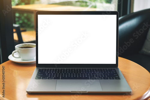 Fototapeta premium Mockup image of laptop computer with blank white desktop screen on wooden table