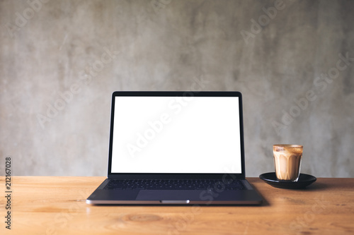 Fototapeta premium Mockup image of laptop with blank white desktop screen and coffee cup on...