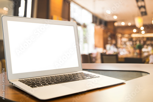 Fototapeta premium Mockup image of laptop with blank white desktop screen on wooden table in modern cafe.