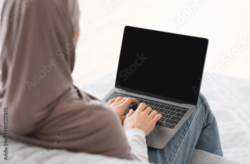 © Prostock-studio, Naklejka premium Mockup image of unrecognizable muslim woman working on laptop with black screen at home, sitting on couch, over shoulder view with free space