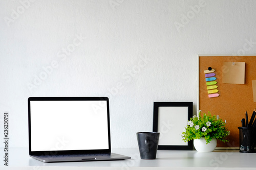 Obraz premium Mockup laptop computer on office table with office supplies.