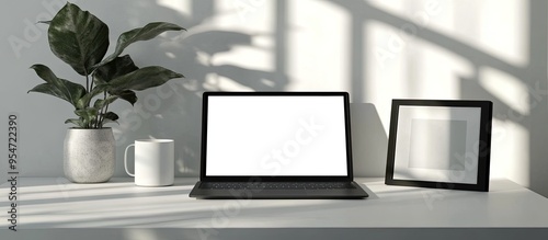 © vxnaghiyev, Obraz premium Mockup laptop with a blank screen a picture frame and a coffee cup on a white table. with copy space image. Place for adding text or design