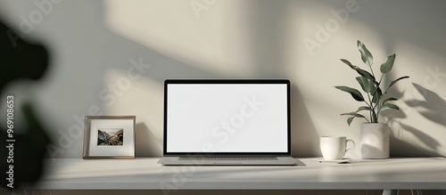 © vxnaghiyev, Obraz premium Mockup laptop with a blank screen a picture frame and a coffee cup on a white table. with copy space image. Place for adding text or design