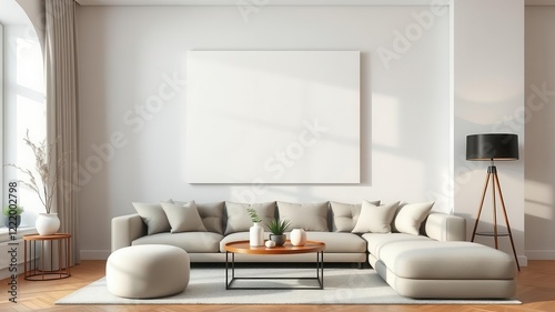 Obraz premium Mockup of blank canvas on living room wall with modern art print, blank,...