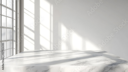 © CreativeCreations, Fototapeta premium mockup product display, a marble table with a window shadow drop on a white wall background