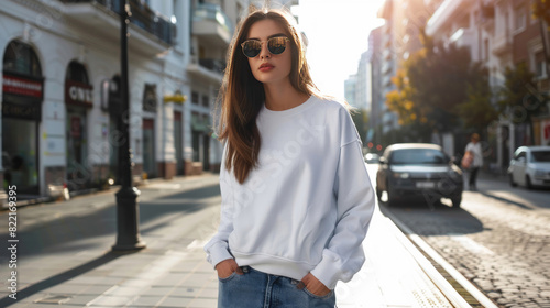 © NooPaew, Fototapeta premium Mockup. Young woman wearing blank white crewneck sweatshirt in city street in sunny day. Mock up template for sweatshirt design, print area for logo or design.