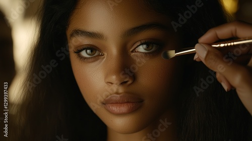© mlangsen, Obraz premium Model Getting Eye Makeup Done By Makeup Artist In Studio. Beauty shot for blog