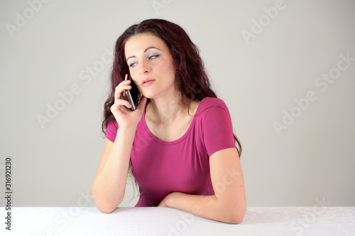 © Вячеслав Чичаев, Fototapeta premium Model is smiling and talking on the phone. Portrait of a pretty slender brunette woman in a pink dress and with brown hair sitting at a table on a white background in the studio.