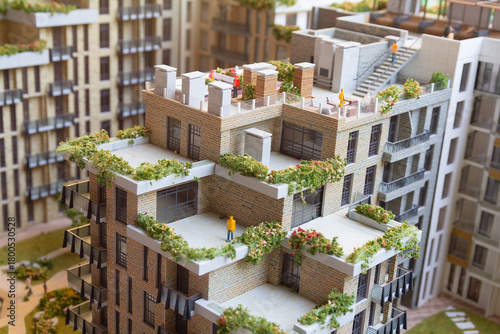 Obraz premium Model of a multi-storey residential building with plants on the terraces....
