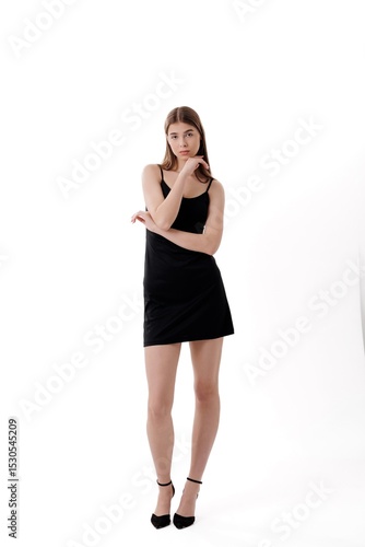 © Svetlana, Fototapeta premium Model poses confidently in a black dress with elegant heels in a minimalist studio setting