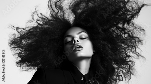 © Sawyer0, Fototapeta premium Modelka o olśniewającej urodzie prezentuje się w wyrazistej stylizacji, w której jej ogromne, bujne włosy przyciągają wszystkie spojrzenia.