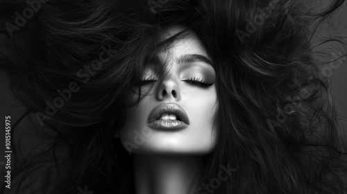 © Sawyer0, Obraz premium Modelka o olśniewającej urodzie prezentuje się w wyrazistej stylizacji, w której jej ogromne, bujne włosy przyciągają wszystkie spojrzenia.
