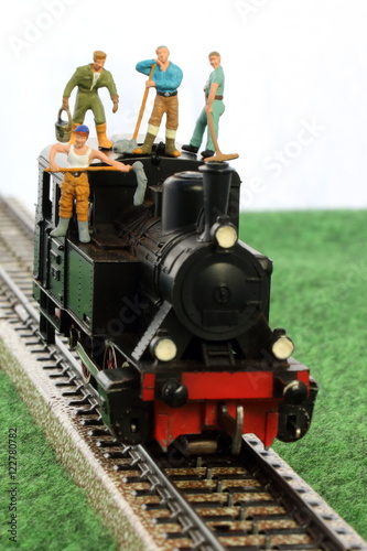 Fototapeta premium Modelleisenbahn, Männchen putzen Dampflok