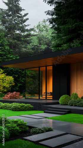 © rifqi, Fototapeta premium Modern A-Frame House with Large Windows and Warm Evening Lighting in Tranquil Landscape