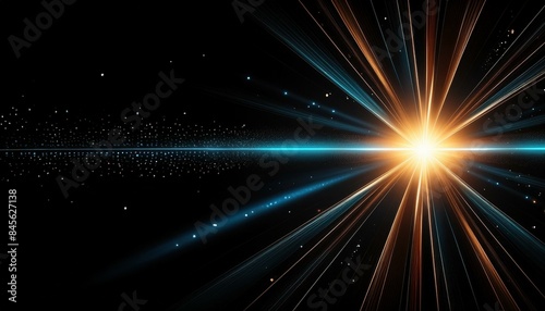 Naklejka premium Modern abstract sun burst, digital flare, iridescent glare, lens flare effects over black background for overlay designs