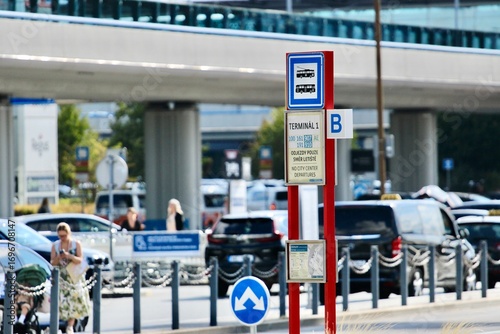 © Victoria, Fototapeta premium Modern airport terminal with road signs, parking directions, passengers with luggage, shuttle bus stops, and glass architecture highlighting international travel and transportation.