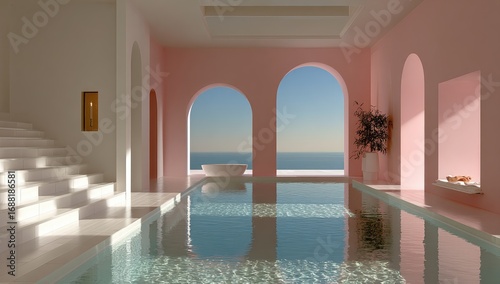 © Yusnira, Fototapeta premium Modern, airy pool house with pink accents