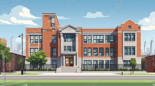 © Umer, Fototapeta premium Modern american school building exterior with large windows and green lawn in daylight – educational architecture and learning environment concept