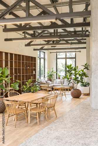 Fototapeta premium modern and bright interior featuring light wood furniture and abundant plants