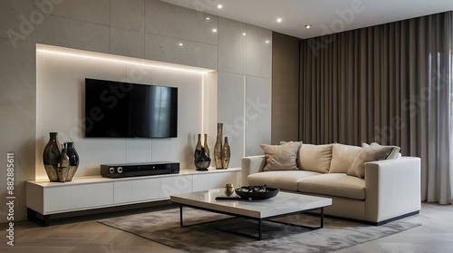 Fototapeta premium modern and minimal living room interior design, TV wall design, contemporary...