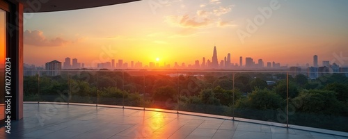 Obraz premium Modern apartment balcony offers stunning city skyline view. Golden sunset...