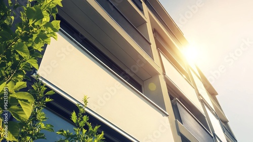 © Elshad Karimov, Obraz premium Modern apartment building adorned with exterior roller blinds, providing both sunlight protection and enhanced security for residents.