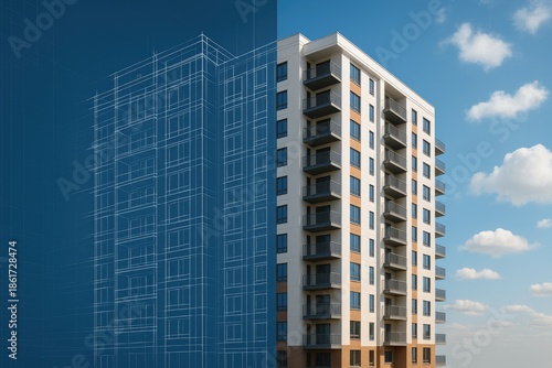 © MD, Obraz premium Modern apartment building construction blueprint to reality concept with balconies and windows.