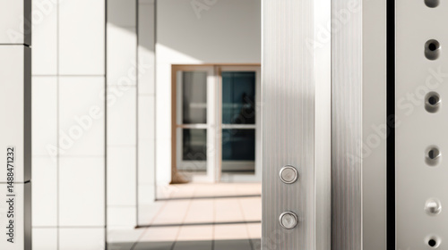 © Chon.Design, Fototapeta premium Modern apartment building exterior with metallic entrance door, window, tiled balcony, and urban urban architecture design with clean lines and minimal style
