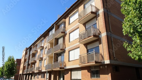 © nataliya_ua, Obraz premium Modern Apartment Building Facade with Balconies and Lush Greenery on a Sunny Day