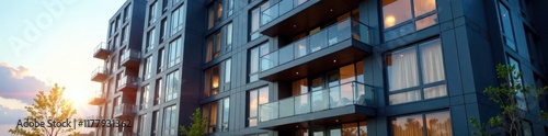 Fototapeta premium Modern apartment building facade with sleek glass and steel exterior,...