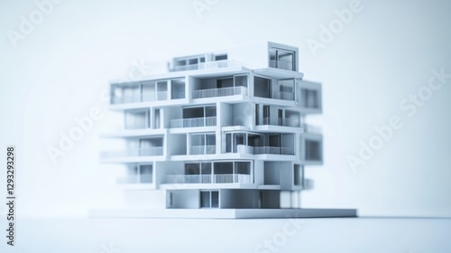 © lestari, Fototapeta premium Modern apartment building model, architectural design, white background, urban development