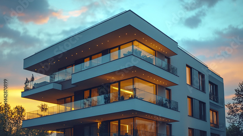 © Thanthara, Obraz premium Modern apartment building with large windows and balconies at sunset, showcasing warm lighting