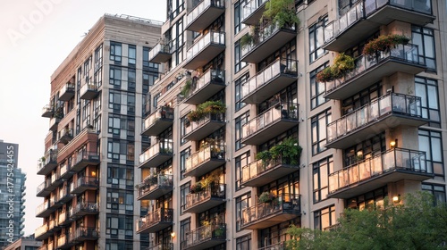 © At My Hat, Obraz premium Modern apartment buildings with balconies and glass railings in the city. Good for illustrating urban living, real estate, and architectural designs.