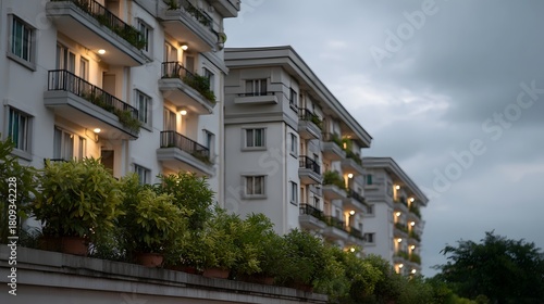 © Thares2020, Obraz premium Modern apartment buildings with balconies illuminated and lush greenery under a cloudy sky