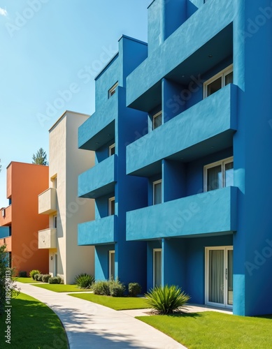 © Pete, Obraz premium Modern apartment buildings with colorful facades, blue, beige, orange. Residential complex features green lawns, walkway, clear sky. New homes architecture for urban living. Property estate