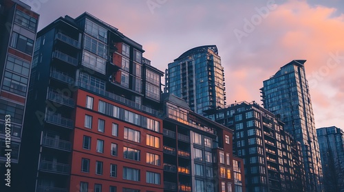 © DIKADOBE, Naklejka premium Modern apartment buildings with glowing windows against a colorful evening sky.