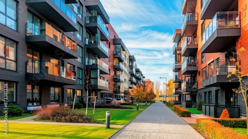 Fototapeta premium Modern Apartment Complex with Green Pathway - A modern apartment complex with...