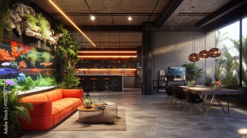 Naklejka premium Modern apartment interior with large aquarium, plants, and lounge area.