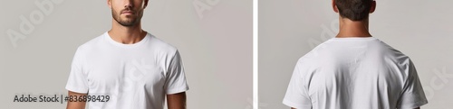 © ParinApril, Fototapeta premium Modern apparel display, man wearing a classic white tshirt, both front and rear views, ideal for fashion catalogues