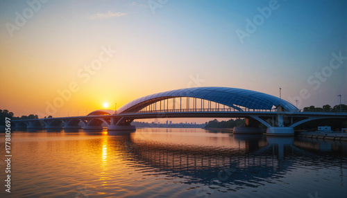 © Mahamud, Fototapeta premium Modern arch bridge over water reflecting sunset sky