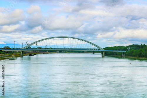 © Gelia, Fototapeta premium Modern arched Apollo bridge and Danube river in Bratislava, Slovakia