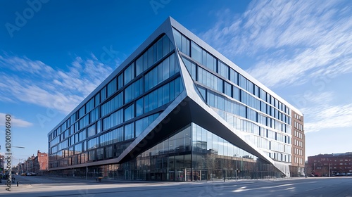 Fototapeta premium Modern architectural building with a unique angular design and reflective...