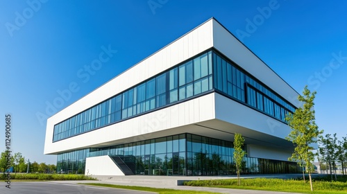 Fototapeta premium Modern Architectural Building with Large Windows and Clear Blue Sky
