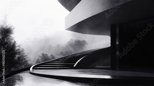 Fototapeta premium Modern architectural curves leading to foggy nature scene